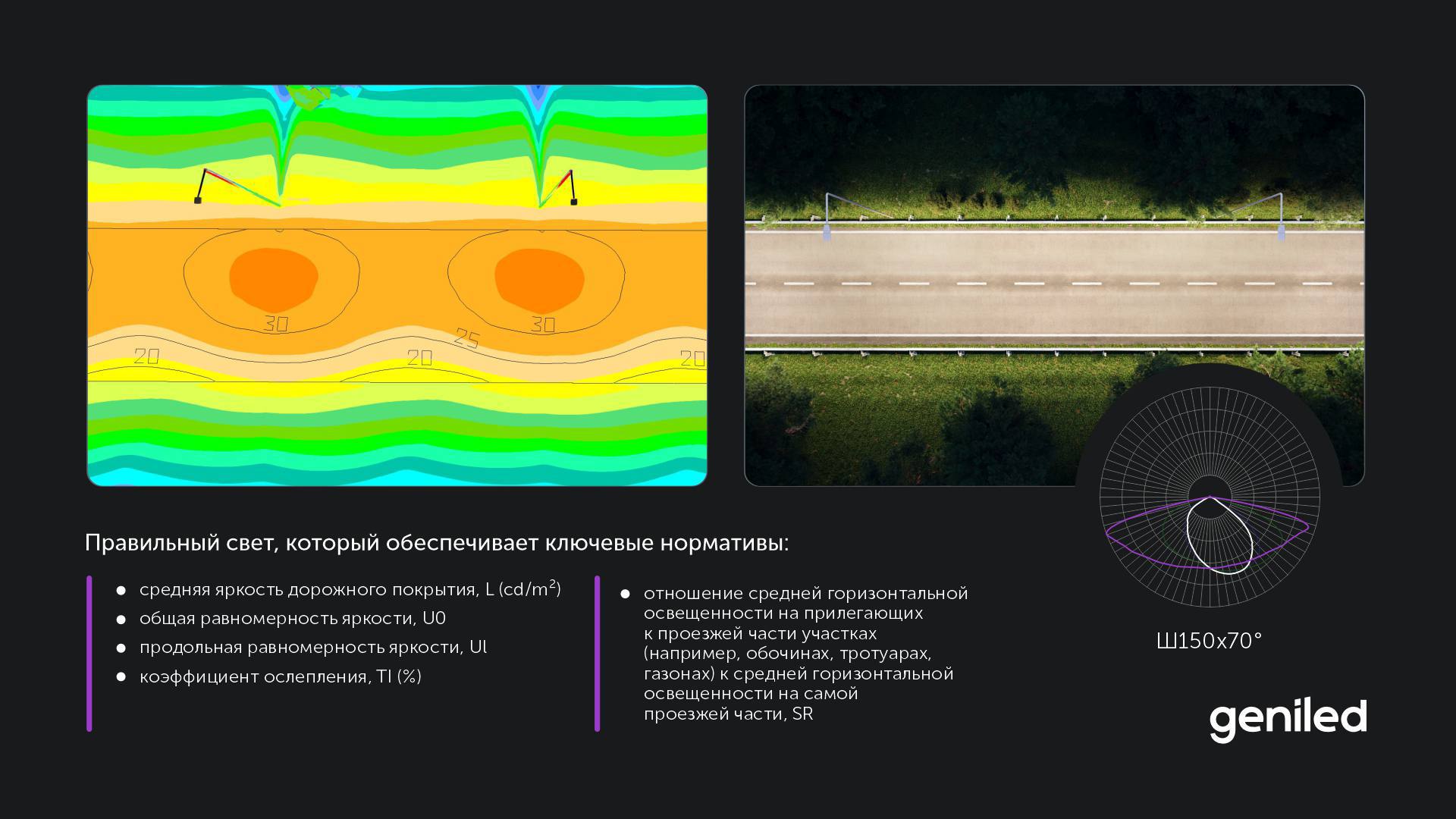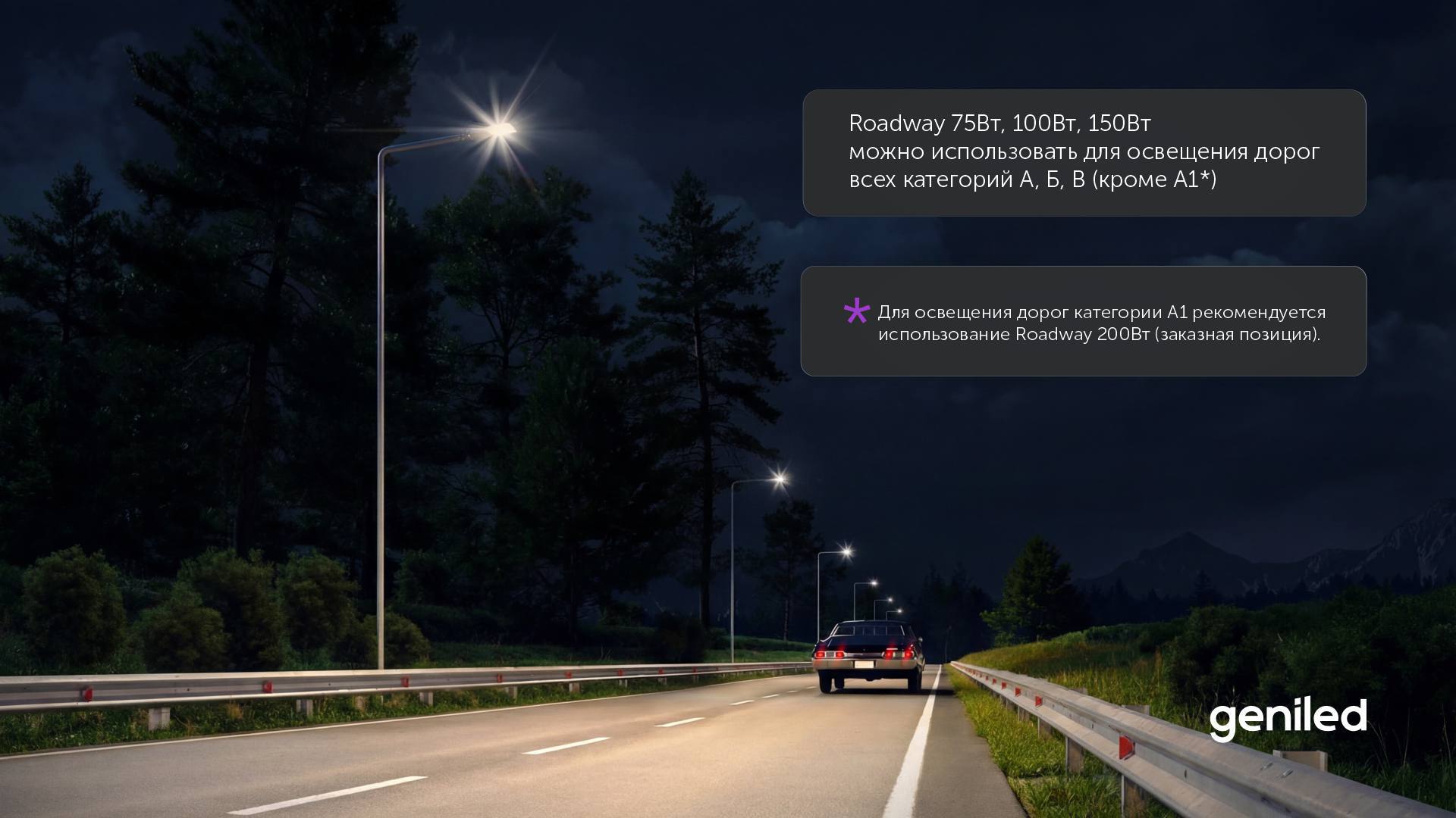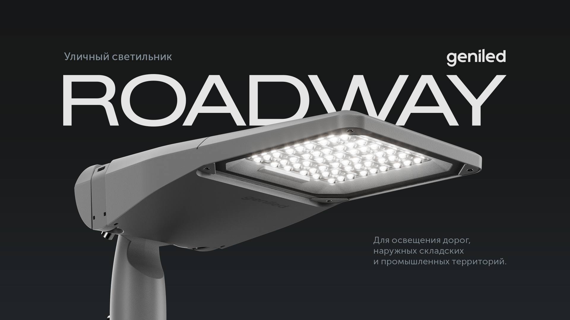 Организация наружного освещения требует оборудования, которое установили — и забыли. Geniled Roadway разработан именно по такому принципу. Он обеспечивает нужную среднюю яркость и ее равномерность на дорожном полотне, полностью исключая эффект ослепления водителей.