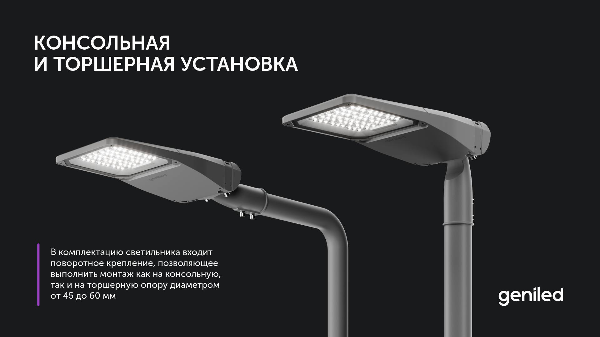 - Универсальное крепление: Поворотный узел позволяет монтировать светильник как на консольную, так и на торшерную опору (Ø 45–60 мм). Угол наклона легко регулируется.