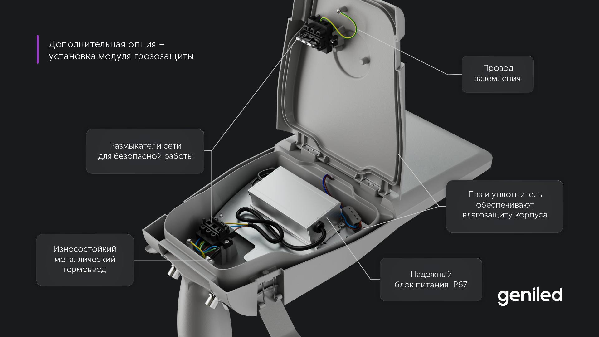 Именно поэтому мы берем на себя полный цикл снабжения, проектирования и доставки. Мы комплектуем объекты любой сложности — от стадии «зародыша» до полного ввода в эксплуатацию. И сегодня, в рамках комплексного подхода к оснащению промышленных и инфраструктурных объектов, мы представляем новинку в нашем ассортименте — уличный консольный светильник Geniled Roadway.