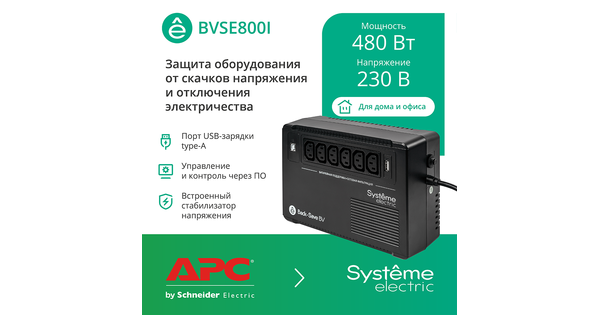 ИБП Back – Save BVSE800I 800ВА/480Вт предназначен для использования в домашних условия и офисах. Удобный порт USB-зарядки type-A с батарейной поддержк..