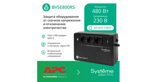 ИБП Back – Save BVSE800RS 800ВА/480Вт предназначен для использования в домашних условия и офисах. Удобный порт USB-зарядки type-A с батарейной поддерж..