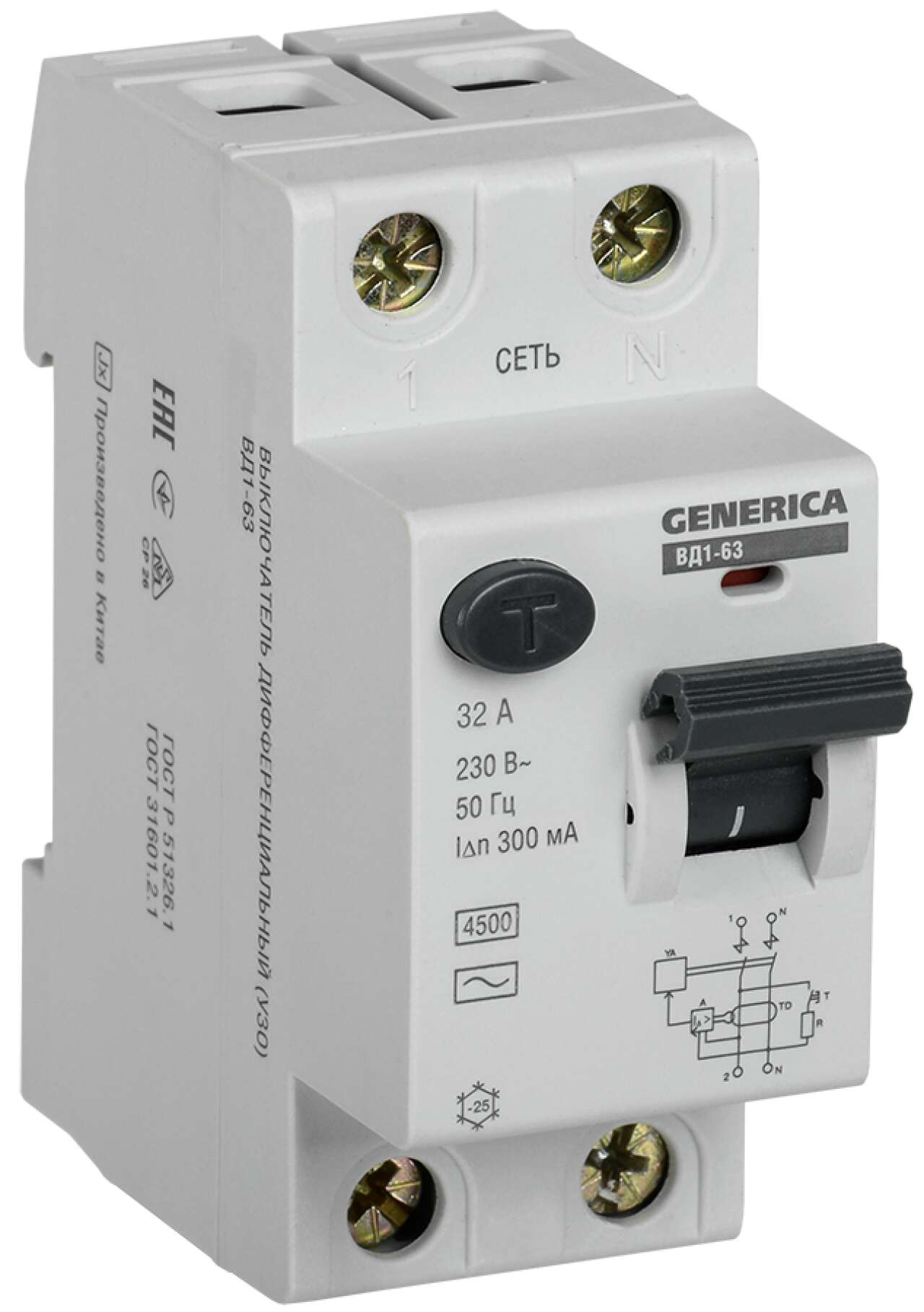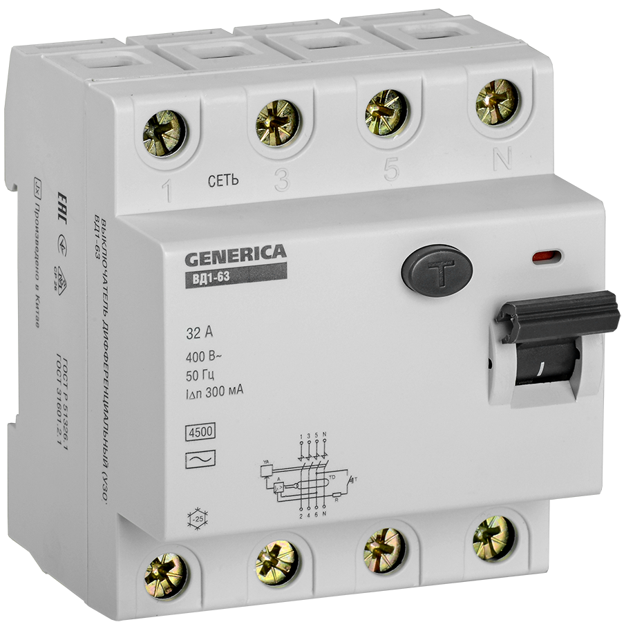 Быстродействующий защитный выключатель ВД1-63 (УЗО) GENERICA - устройство электронного типа, зависящее от напряжения и реагирующее на дифференциальный..