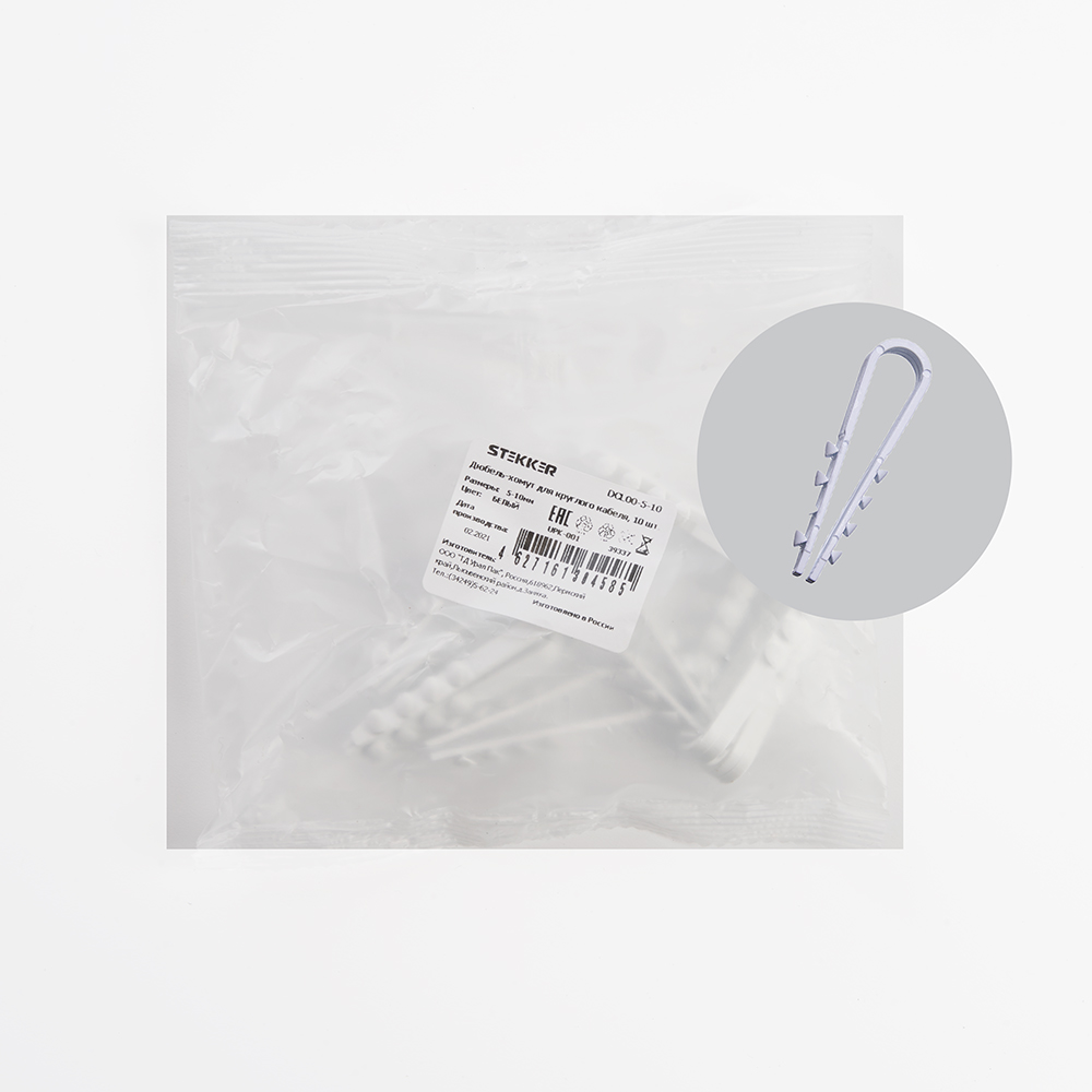 Хомут электромонтажный STEKKER DCL00-5-10, одноразовый, белый, материал - полипропилен, максимальный диаметр пучка - 10мм, нагрузка - -кг, диапазон ра..