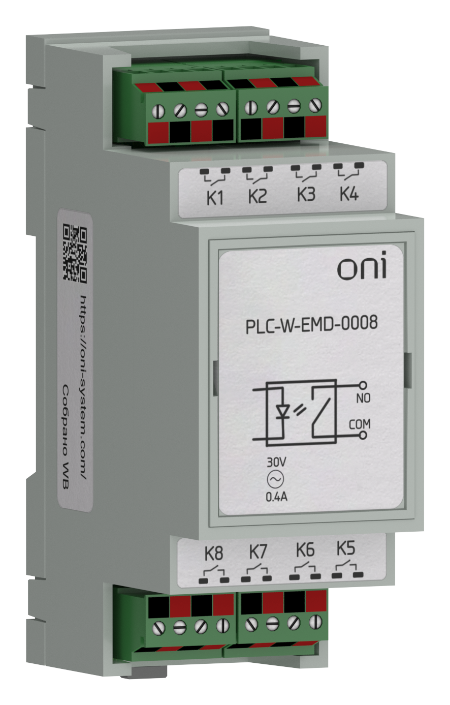 Модуль расширения входов/выходов для контроллеров PLC-W 8 DO. 8 дискретных выходов типа "сухой контакт". Максимальное коммутируемое напряжение 30 В AC..