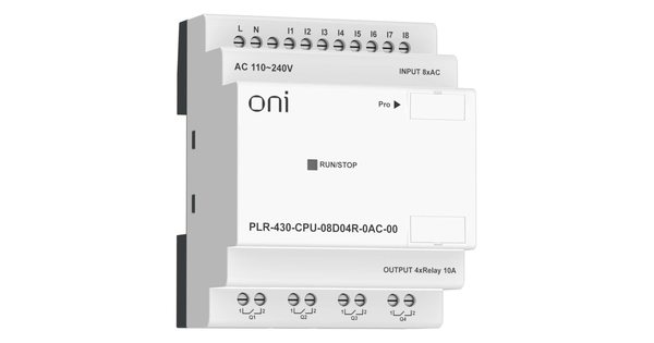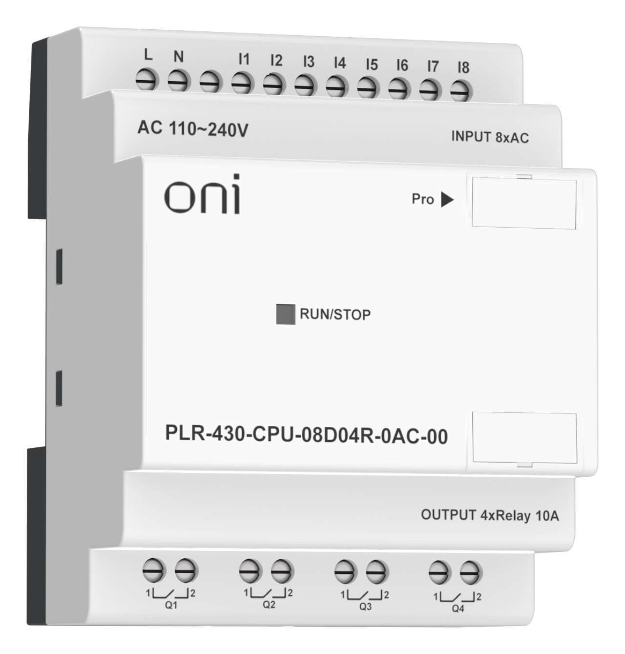 Модуль ЦПУ ПЛК 430 ONI без возможности расширения количества каналов ввода-вывода и коммуникаций. Без встроенного экрана. 8 дискретных входов и 4 реле..