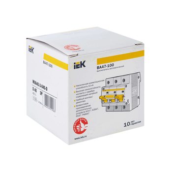 - Увеличенная коммутационная способность 10000А позволяет устанавливать ВА47-100 в качестве вводных автоматических выключателей.