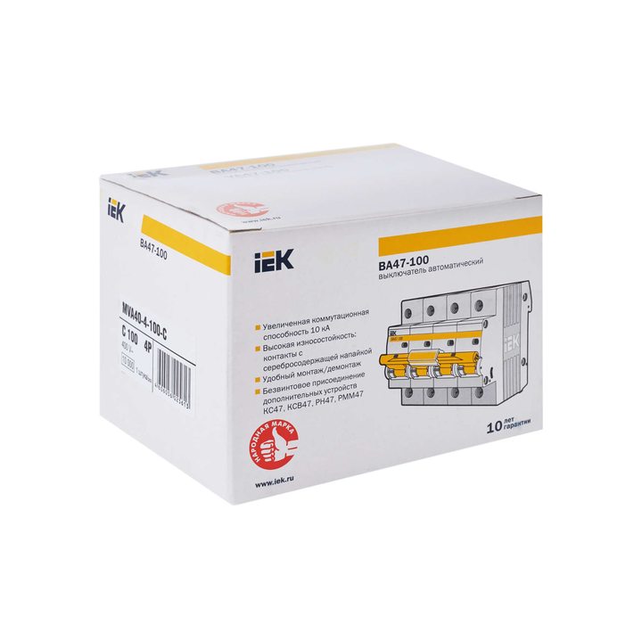 - Увеличенная коммутационная способность 10000А позволяет устанавливать ВА47-100 в качестве вводных автоматических выключателей.