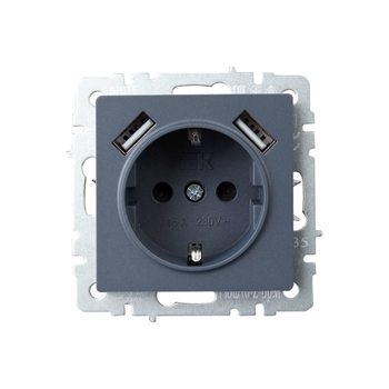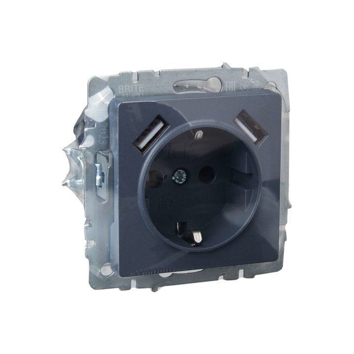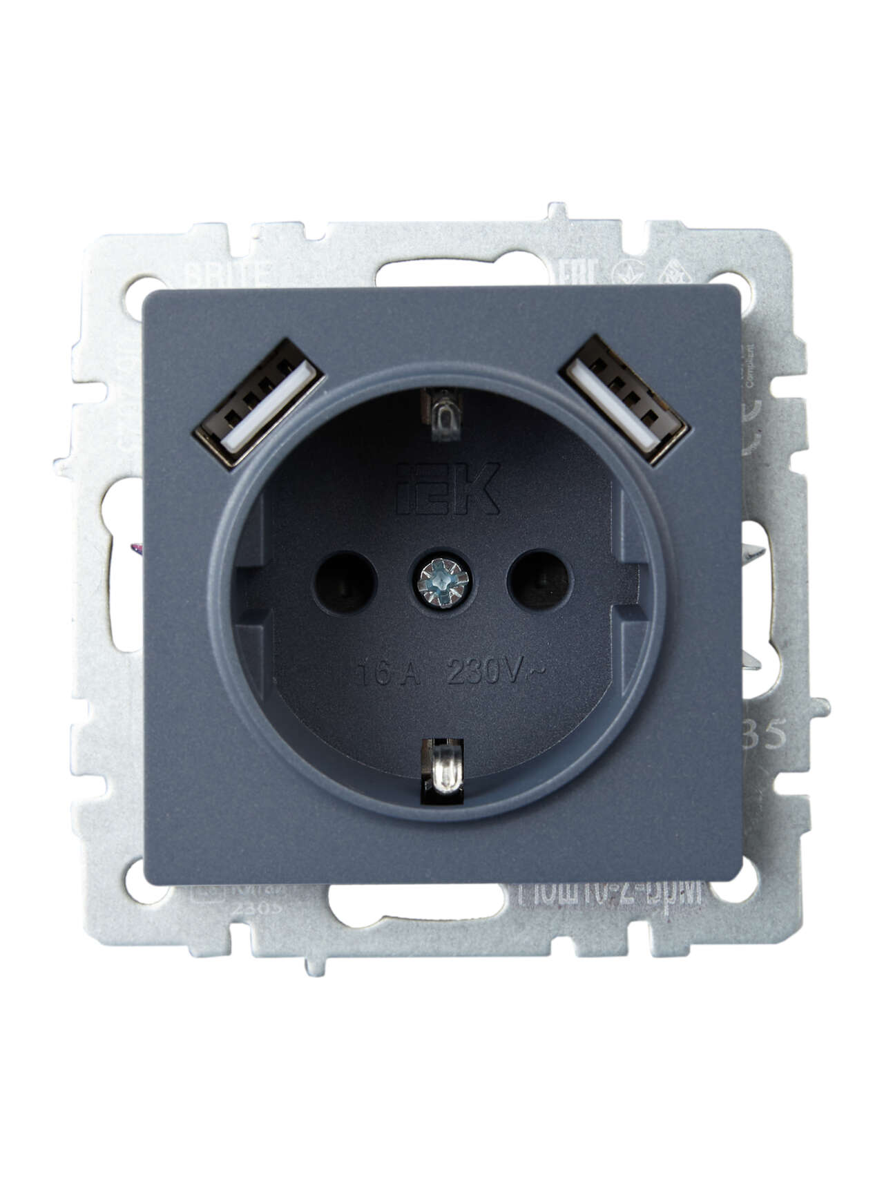 BRITE Розетка 1-местная с заземлением с защитными шторками 16А с USB A+A 5В 3,1А РЮш10-2-БрМ маренго IEK