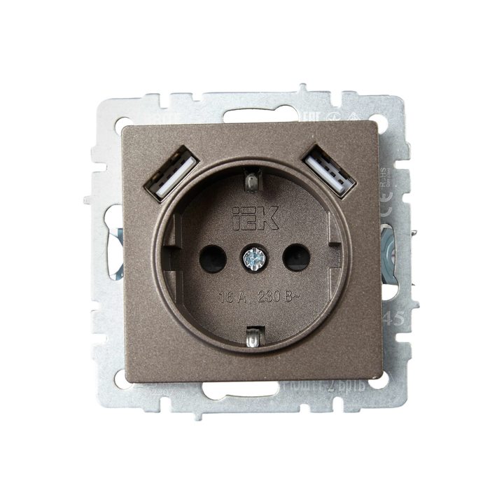 BRITE Розетка 1-местная с заземлением с защитными шторками 16А с USB A+A 5В 3,1А РЮш10-2-БрТБ темная бронза IEK