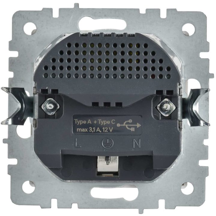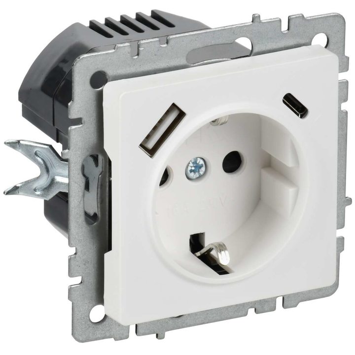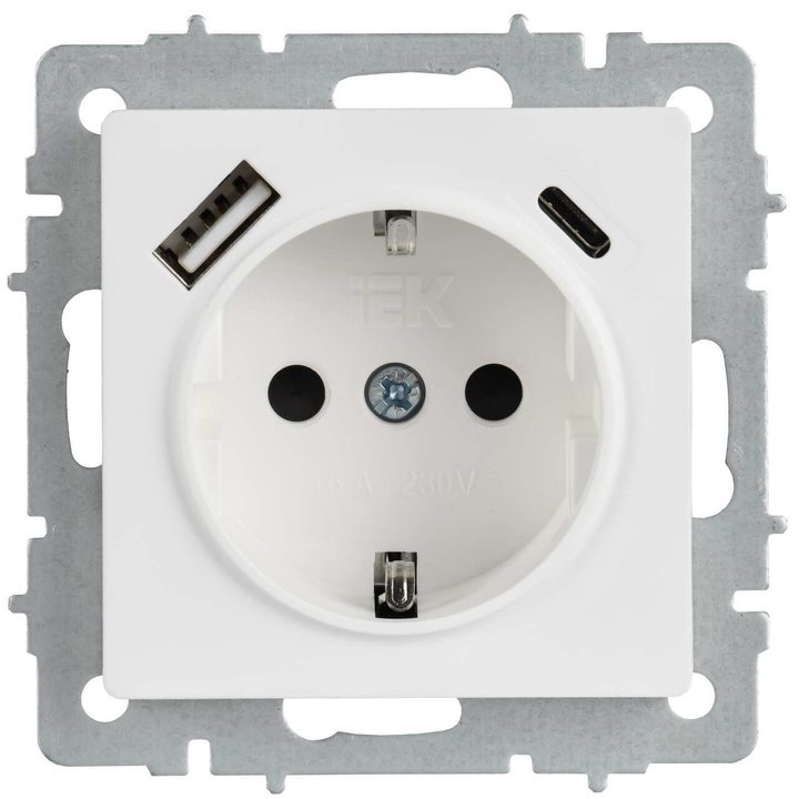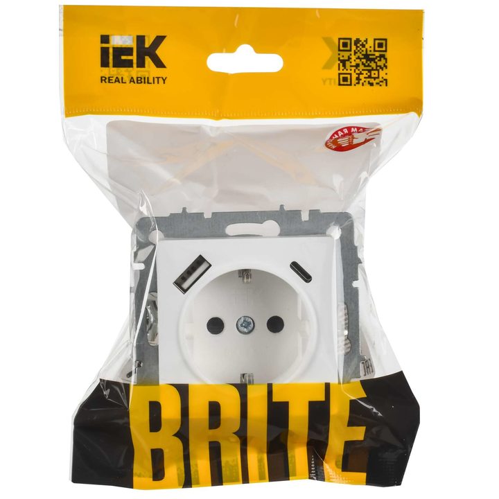 BRITE Розетка 1-местная с заземлением с защитными шторками 16А с USB A+C 18Вт РЮш11-1-БрАБ арктический белый IEK