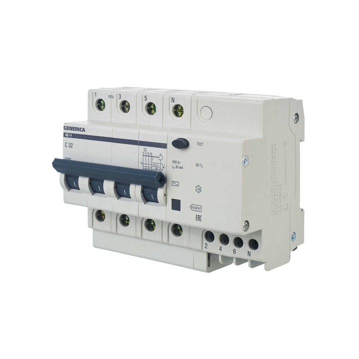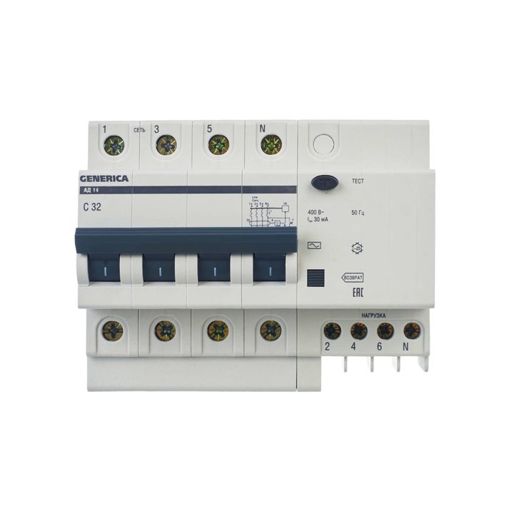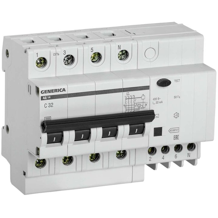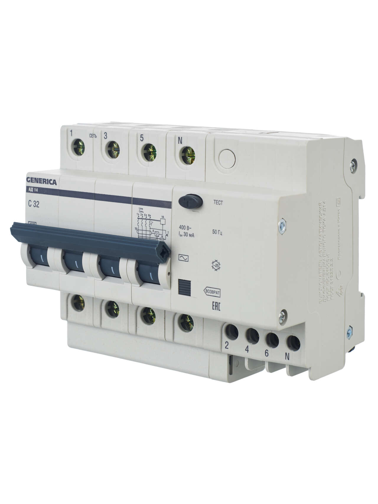 Диф.автомат АД14 4Р 32А 30мА GENERICA
