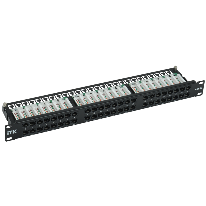 В зависимости от способа крепления, масштабности кабельной системы, типа сети ITK изготавливает патч-панели для настенного монтажа или монтажа в 19-дюймовый конструктив, по количеству портов: 12-, 24-, 25-, 48-, 50-, категорий: 3 (телефонные), 5E, 6, 6A, в экранированном исполнении и без защитного экрана.