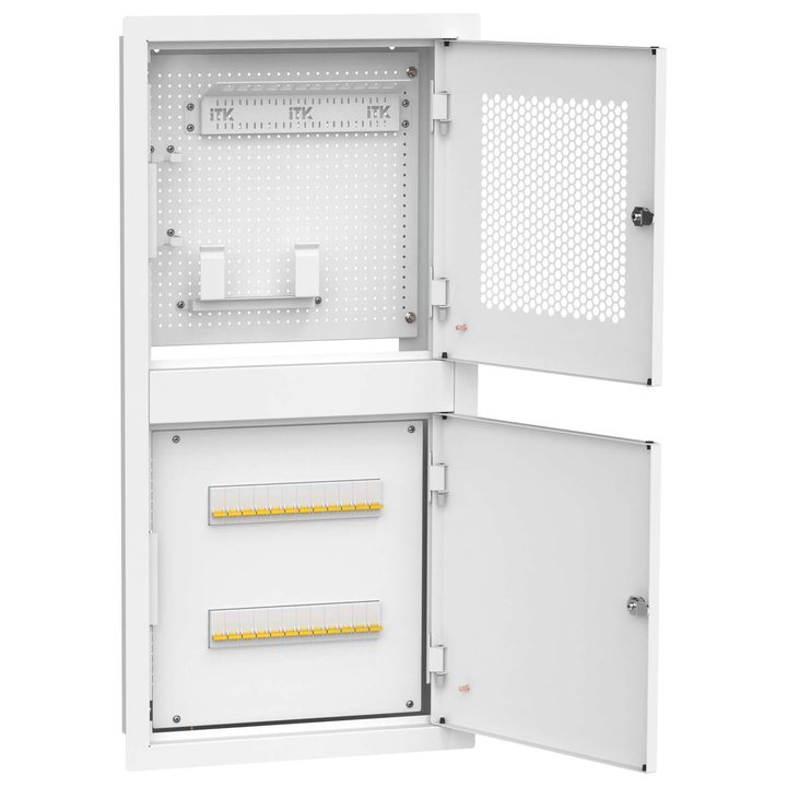 ITK LINEA R Шкаф встраиваемый двухсекционный 1 комната 400х850мм дверь металлическая белый (в комплекте 12 модулей keystone 2 розетки 3 патч-корда (02м) 1 делитель ТВ сигнала (1 вход 2 выхода))