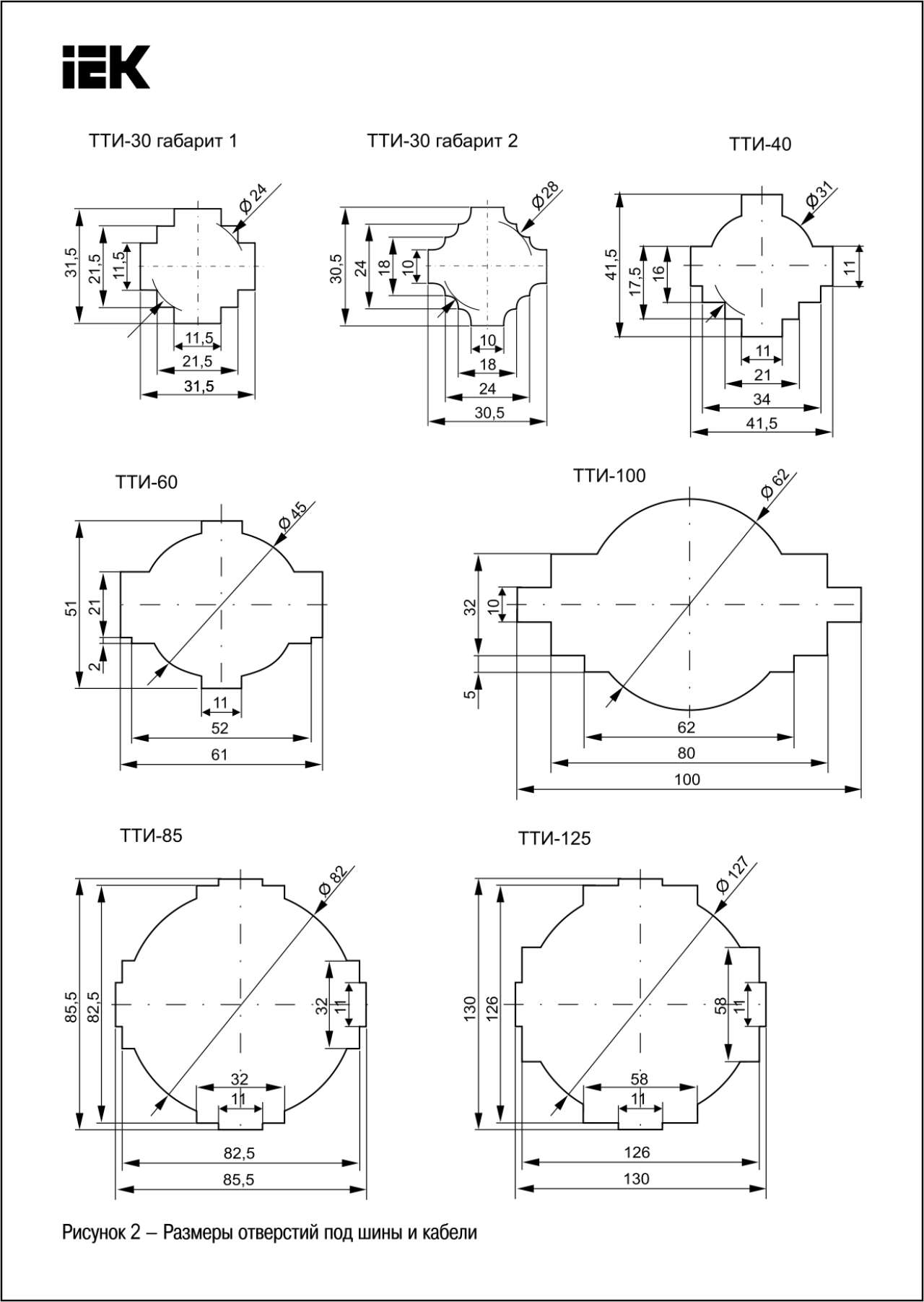 - В комплект каждого трансформатора входит крышка, которой закрываются клеммы вторичной обмотки. Также трансформаторы ТТИ-А комплектуются винтами и гайками для крепления проводников. Трансформаторы ТТИ-30/ТТИ-125 комплектуются скобой для крепления шины в окне трансформатора.