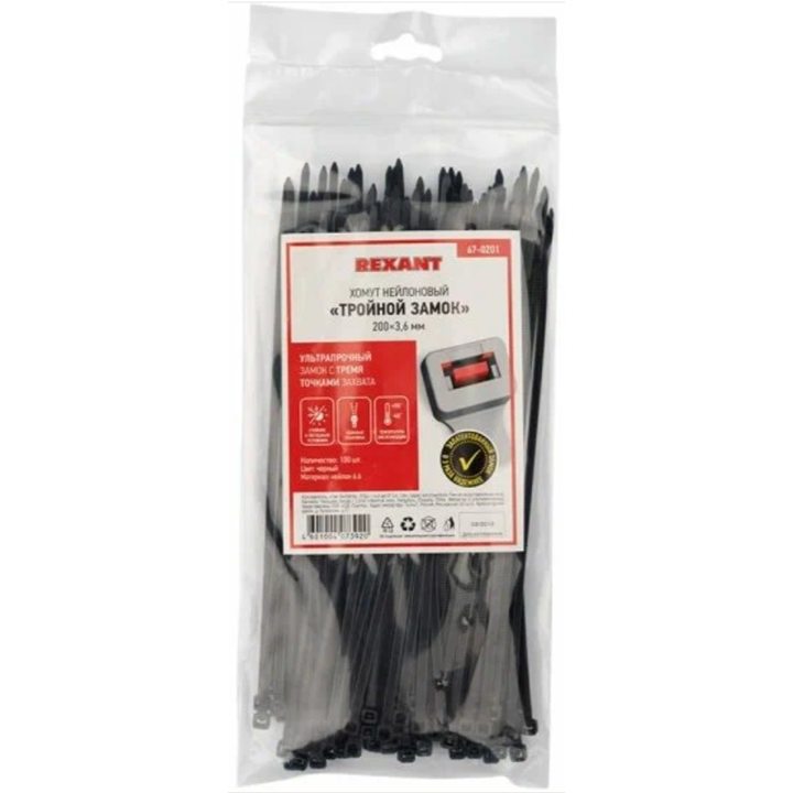 Хомут нейлоновый (кабельная стяжка) 200х3,6 мм чёрный «Тройной замок» предназначен для крепления или обвязки в жгут кабелей и проводов, крепления гибких гофротруб, а также других предметов к несущей поверхности или для соединения между собой. Используется при проведении электромонтажных работ, при монтаже структурированных кабельных систем, для бытовых нужд, а также в других отраслях народного хозяйства.