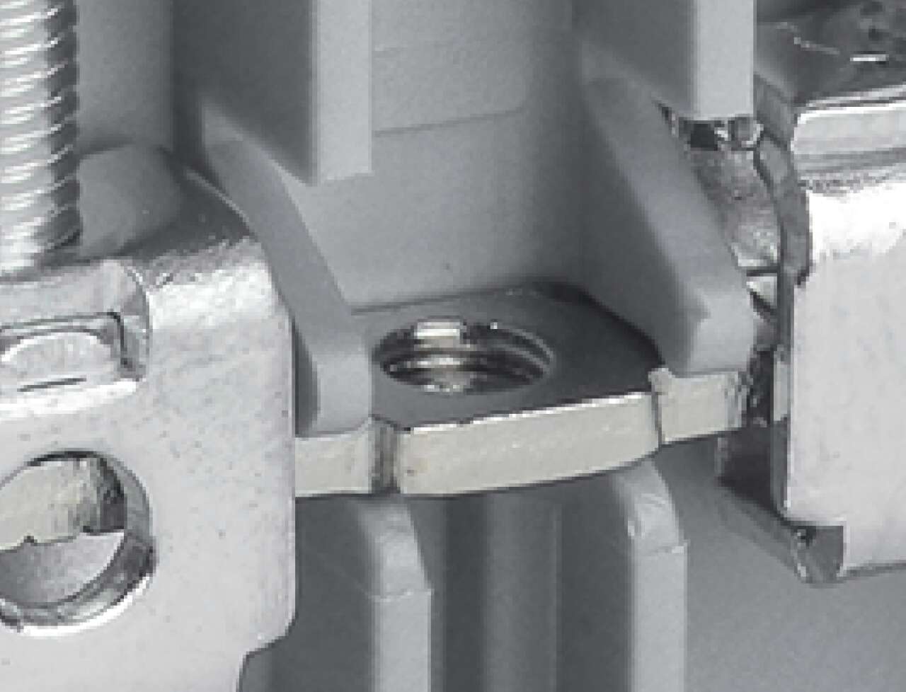 Токоведущая шина фазных клемм, выполненная из латуни или медной пластины (содержание меди не менее 99,7%), имеет специальные насечки для надежной фиксации проводника.