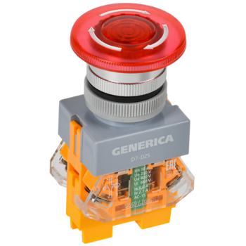 Кнопка управления D7-DZS Грибок d=22мм 1NC+1NO поворотная с подсветкой и фиксацией красная GENERICA