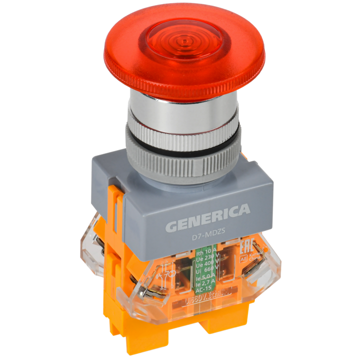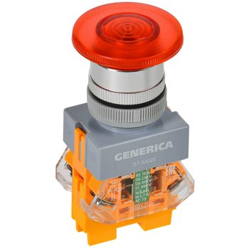 Кнопка управления D7-MDZS Грибок d=22мм 1NC+1NO с подсветкой и фиксацией красная GENERICA