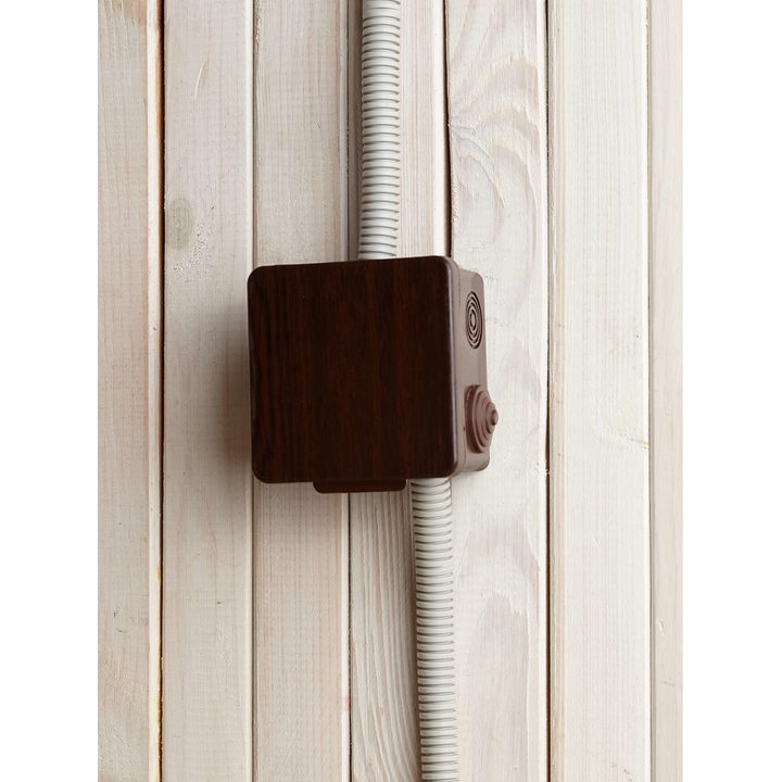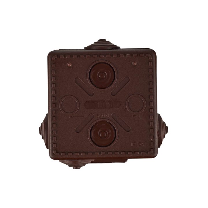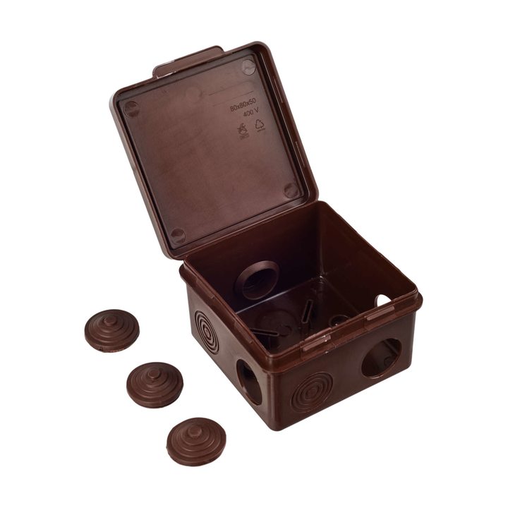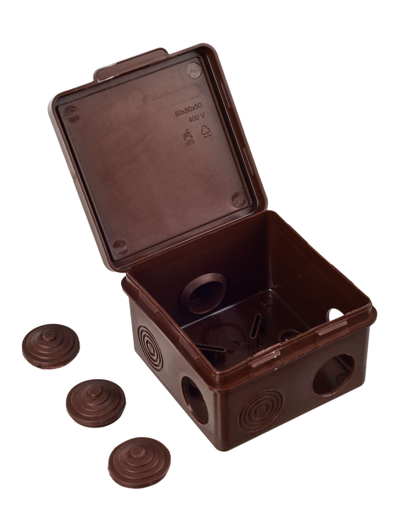 Коробка распаячная КМ для открытой проводки с откидной крышкой 80х80х50мм IP54 7 гермовводов дуб IEK