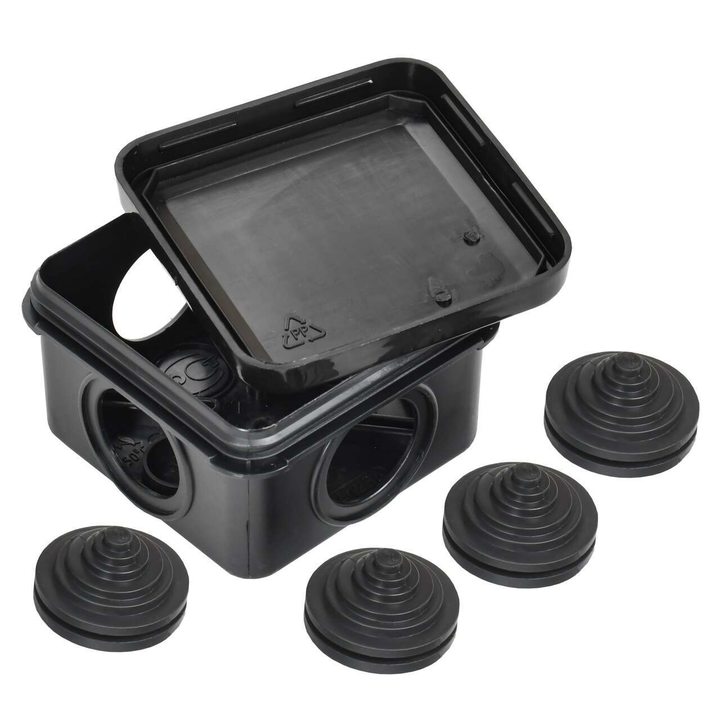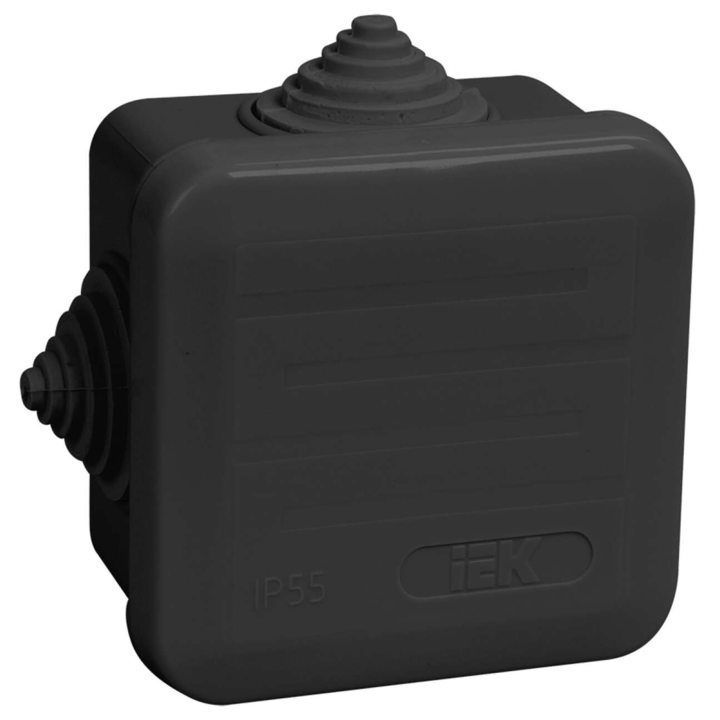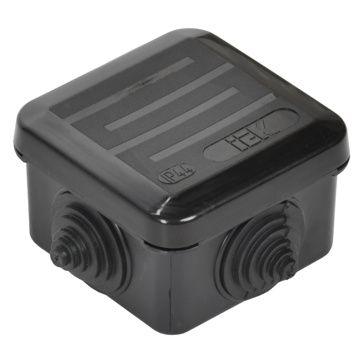 Коробка распаячная КМ41236 для открытой проводки с защелкивающейся крышкой безгалогенная (HF) 70х70х40мм IP44 4 гермовводов черная (RAL 9005) IEK
