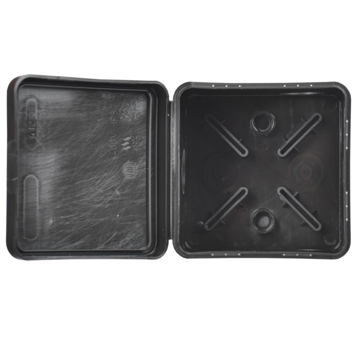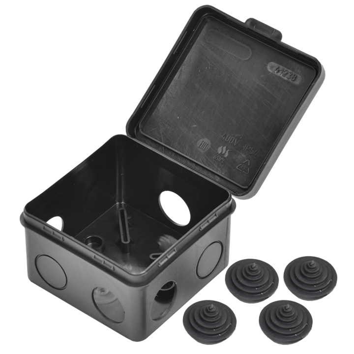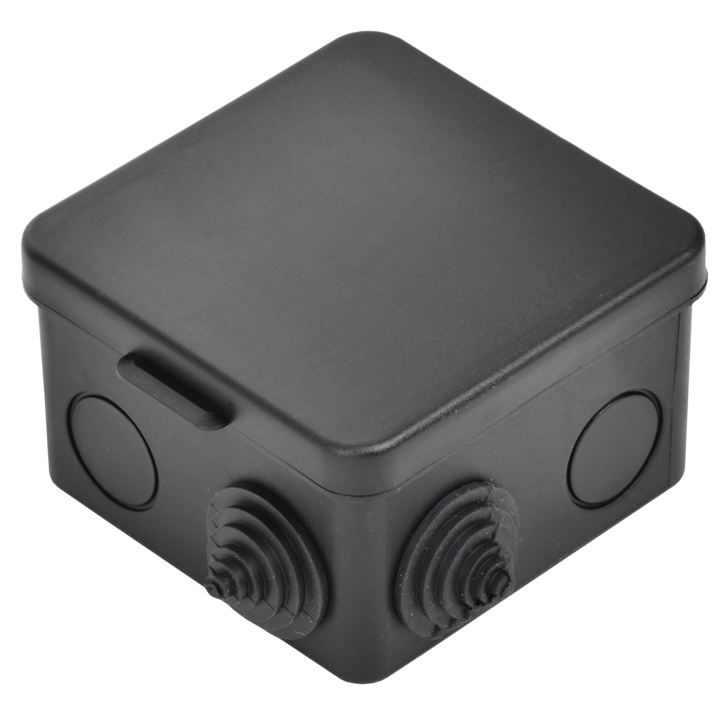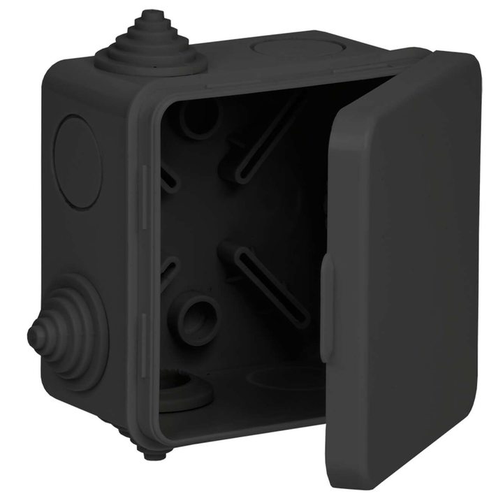 Коробка распаячная КМ41238 для открытой проводки с откидной крышкой безгалогенная (HF) 80х80х50мм IP54 7 гермовводов черная (RAL 9005) IEK
