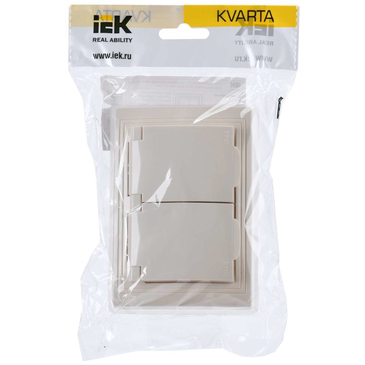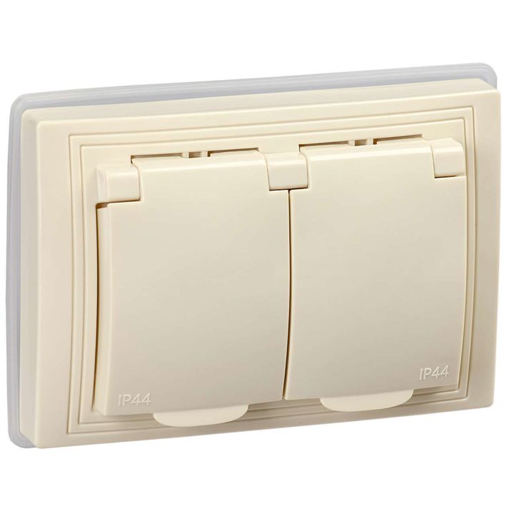 KVARTA Розетка 2-местная с заземлением с защитными шторками с крышкой 16А IP44 РСбш12-3-ККм-44 кремовый IEK