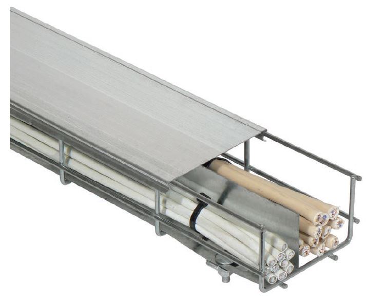 Верхняя продольная проволока немного выступает за габариты лотка, что позволяет использовать совместно с лотком замковую крышку. Замок на крышке позволяет ей надежно держаться при вертикальном монтаже кабельной трассы.