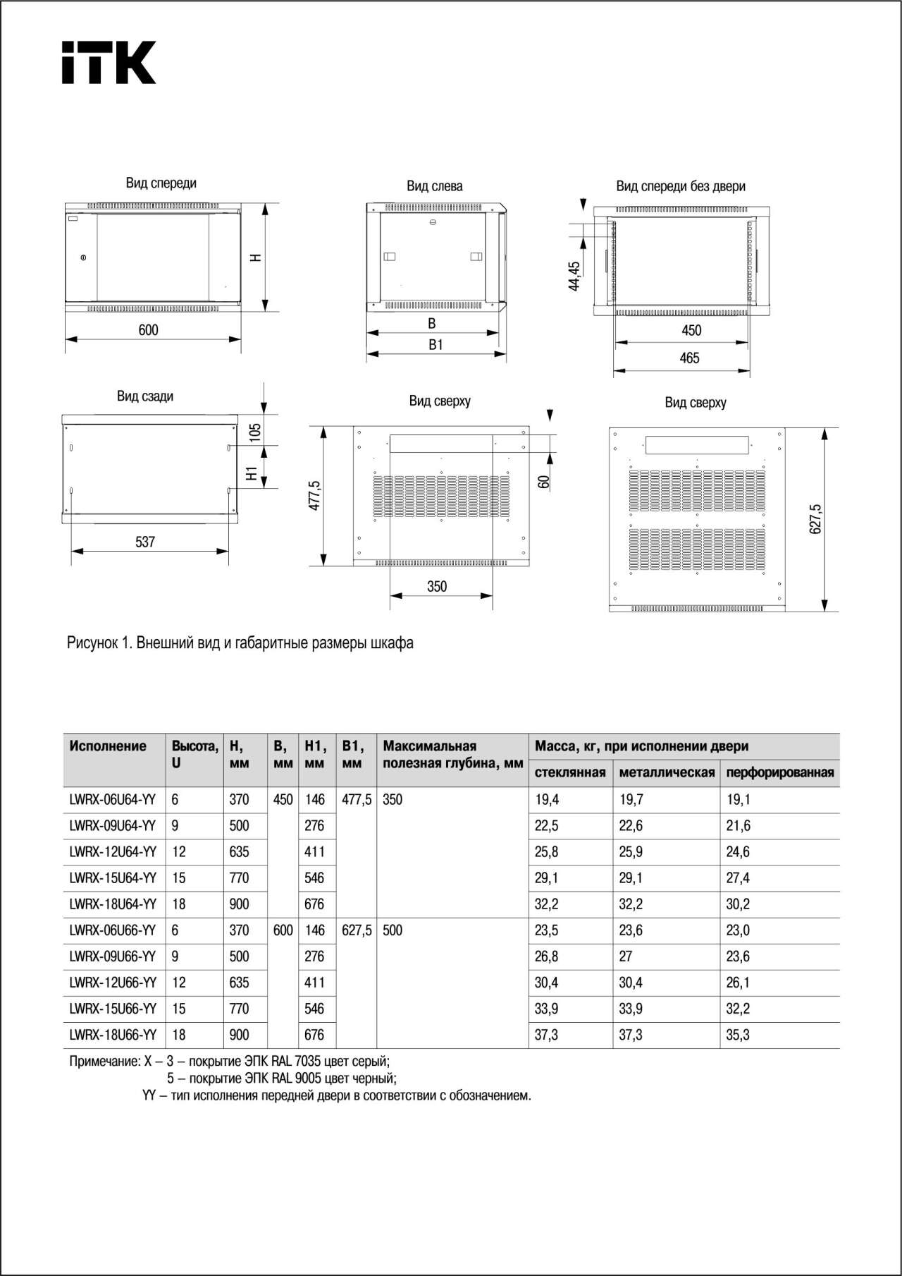 Шкаф 19 дюйм LINEA W 12U 600х450мм настен. метал. дверь RAL9005 ITK