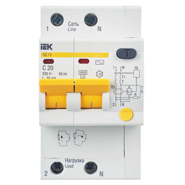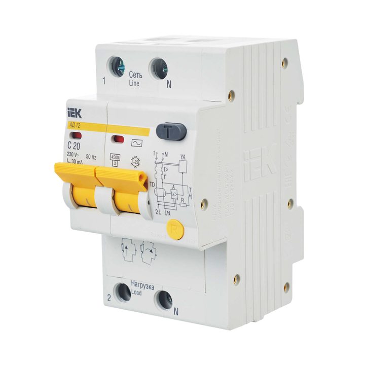 Выключатель автоматический дифференциального тока 2п C 20А 30мА тип AC 4.5кА АД-12 IEK MAD10-2-020-C-030