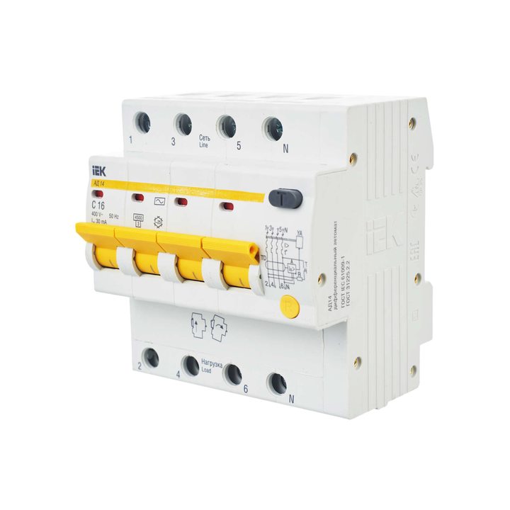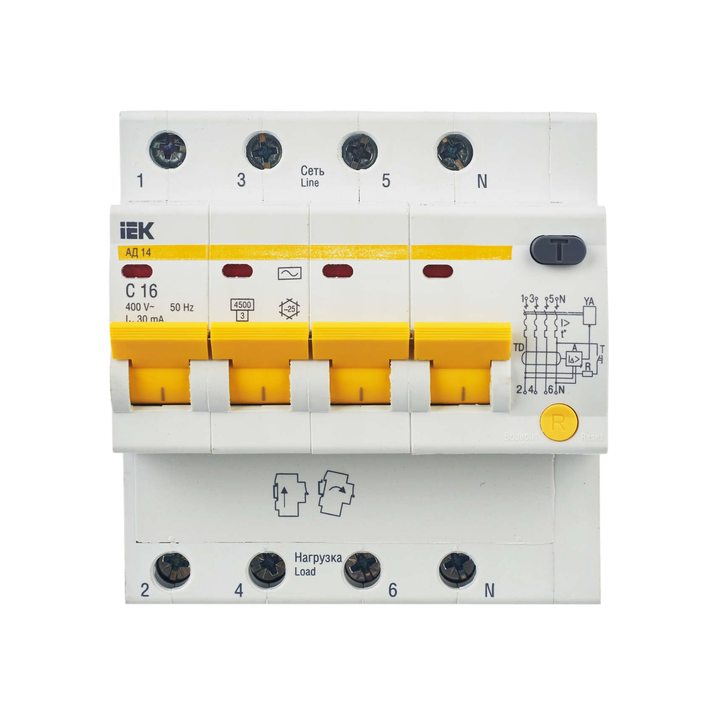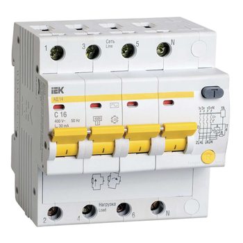 Выключатель автоматический дифференциального тока 4п C 16А 30мА тип AC 4.5кА АД-14 IEK MAD10-4-016-C-030