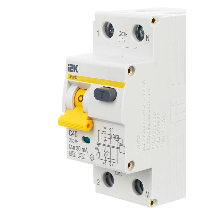 Выключатель автоматический дифференциального тока 2п (1P+N) C 40А 30мА тип A 6кА АВДТ-32 IEK MAD22-5-040-C-30