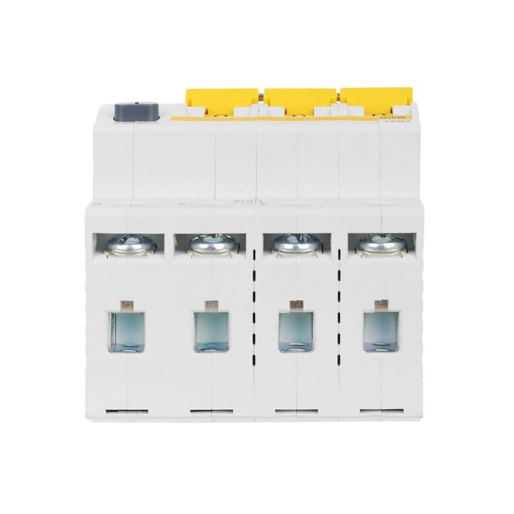 - Главные контакты 4-х полюсного автоматического выключателя дифференциального тока АВДТ34 сконструированы так, что нейтральный контакт замыкается раньше и отключается позже, что позволяет избежать перекоса фаз напряжения нагрузки, аналогично "обрыву нуля" в сети.