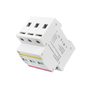 1 - Корпус 2 - Защитный элемент (варисторный модуль) 3 - Индикатор работы устройства 4 - Плавкая вставка (термозащита) Модульное исполнение со стандартными размерами и установкой на DIN-рейку.