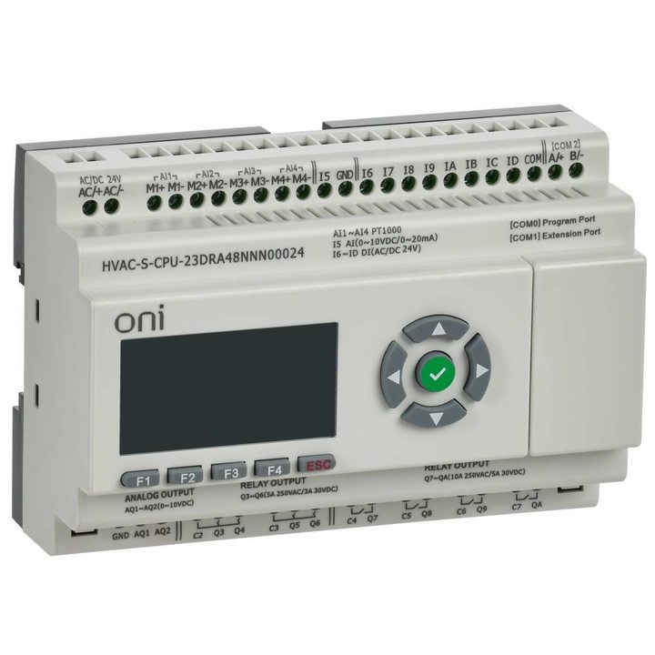 Модуль ЦПУ микро ПЛК ONI с возможностью расширения количества каналов ввода-вывода и коммуникаций с помощью модулей расширения ONI PLR-S. С интегрированным полнофункциональным экраном, 8 дискретными входами, 8 релейными выходами, 1 аналоговым входом (0...20 мА, 0...10 В DC), 4 температурными входами Pt1000, 2 аналоговыми выходами (0...10 В DC). Интегрирован интерфейс RS485 с поддержкой Modbus RTU/ASCII. Напряжение питания 24В AC/DC.