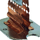 Плавкий элемент выполнен из фосфористой бронзы (сплав меди с цинком с добавлением фосфора) и надежно соединен точечной сваркой с выводами предохранителя.