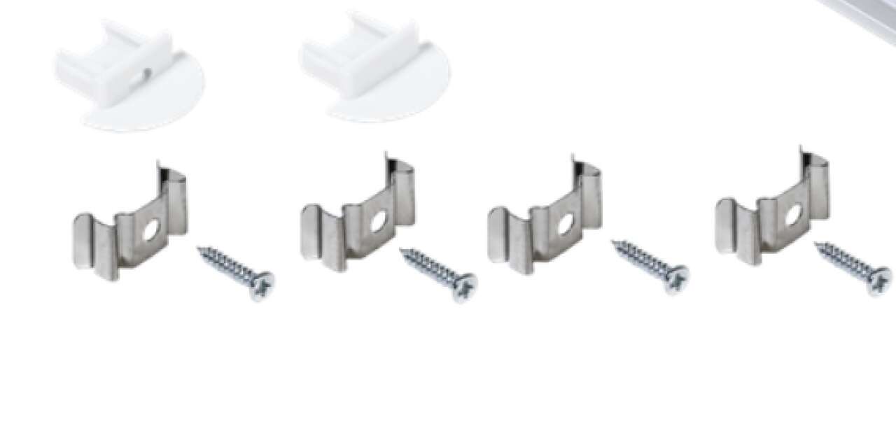 - В комплекте с профилем поставляется всё необходимое для монтажа: торцевые заглушки, крепежные скобы и саморезы.