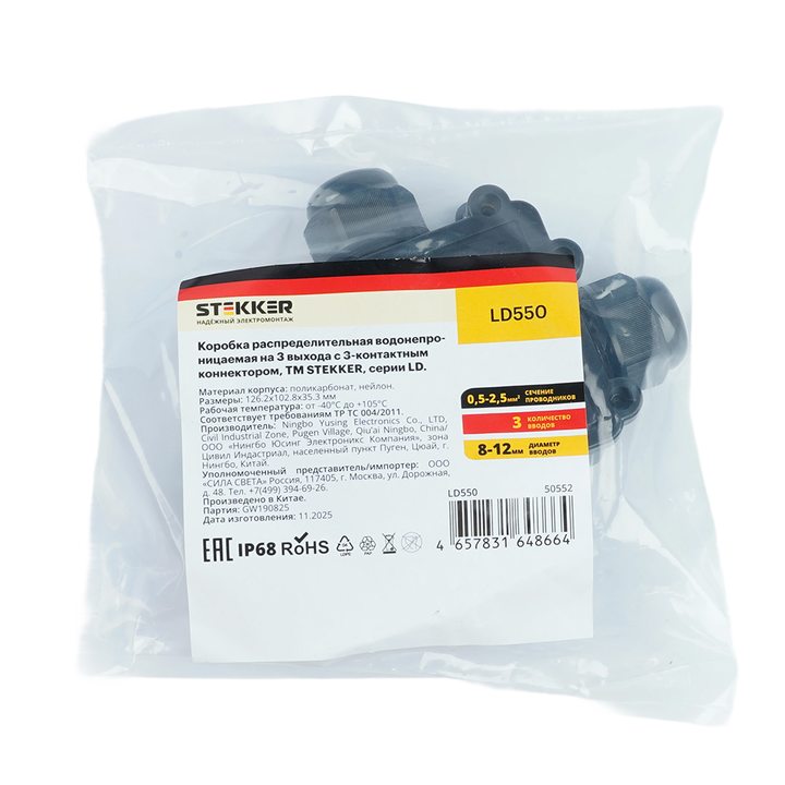 Распределительная коробка STEKKER LD550, количество вводов: 3, поликарбонат, нейлон, цвет черный, размер 126,2*102,8*35,3мм.