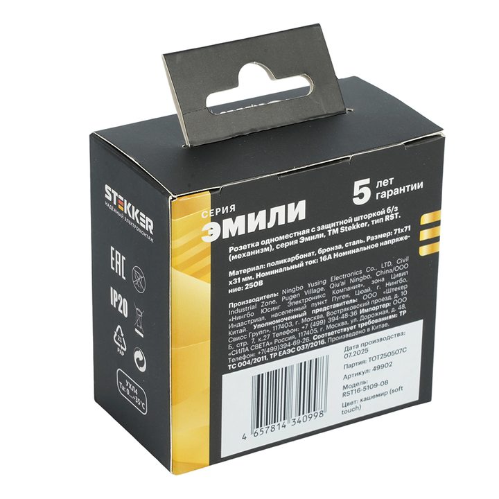 Розетка 1-местная с защитной шторкой (механизм), STEKKER, б/з, 250В, 16А, серия Эмили, RST16-5109-08, кашемир, soft touch