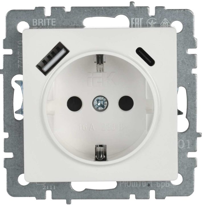 Розетка BRITE РЮш11-1-БрБ 16А с USB A+C 18Вт с заземл. защ. шторки бел. IEK BR-R14-16-U22-018-K01