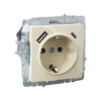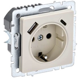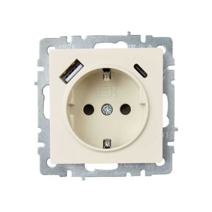 Розетка BRITE РЮш11-1-БрКр 16А с USB A+C 18Вт с заземл. защ. шторки беж. IEK BR-R14-16-U22-018-K10