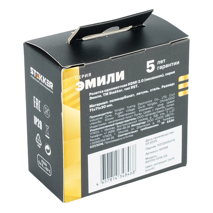 Розетка HDMI 2.0 Type A (механизм), STEKKER, серия Эмили, RST00-5118-09, антрацит, soft touch