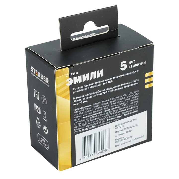 Розетка телевизионная 1-местная (механизм), STEKKER, 75 Ом, 5-862МГц, серия Эмили, RST00-5108-08, кашемир, soft touch