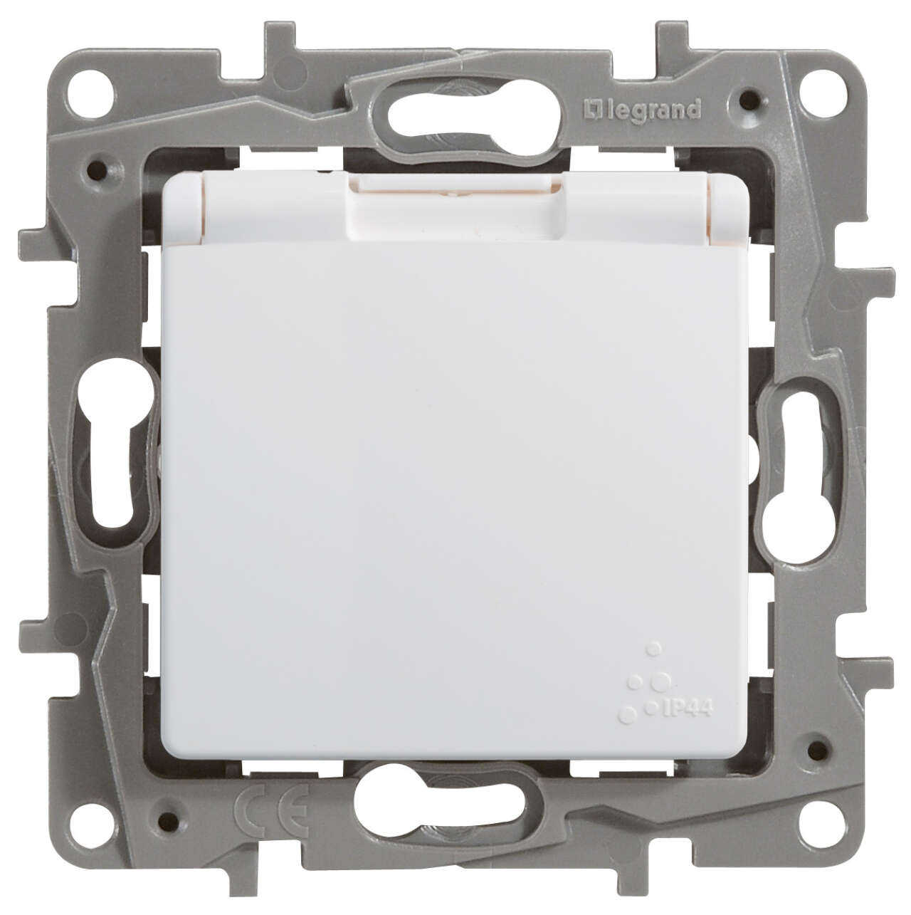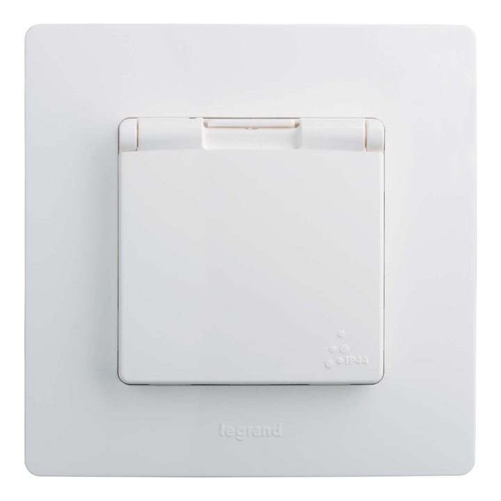 Механизм розетки 1-м СП Etika 2К+З 16А IP44 защ. шторки с заземл. с защ. крышкой безвинт. зажимы бел. Leg 672232