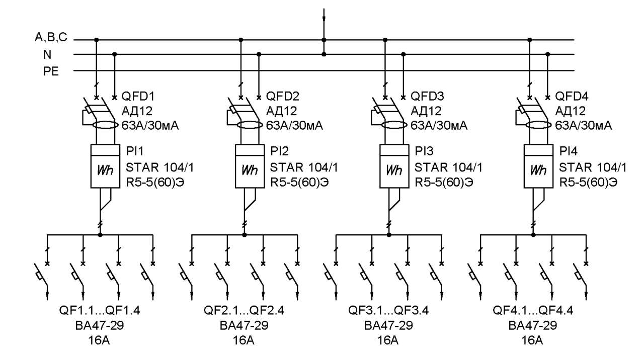 Щит этажный ЩЭ-3416 УХЛ3 с отделением для слаботочных устройств 4 квартиры отходящие на каждую квартиру АД12 2Р 1х63А 30мА выключатели автоматические 1Р 4х16А IEK