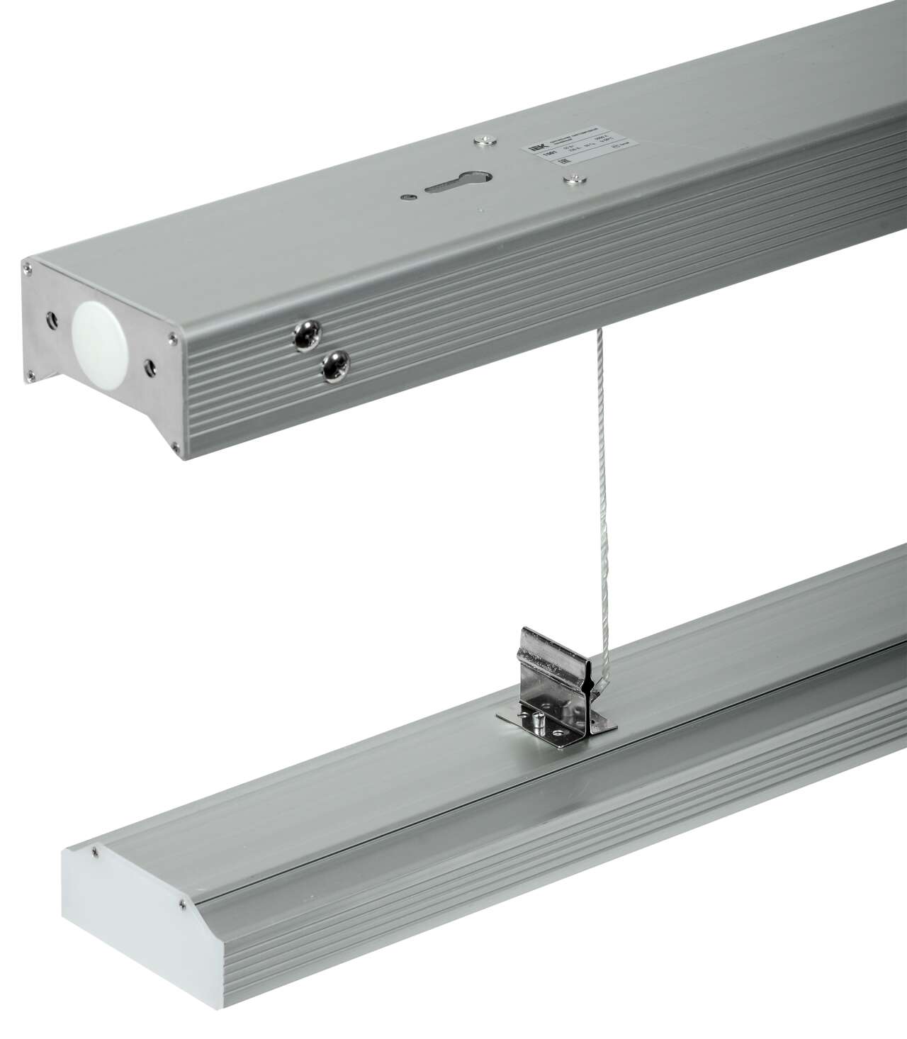 Специальная легкоразборная конструкция корпуса с защелками обеспечивает быстрый доступ к драйверу и кабельной линии без применения инструментов. Для удобства и безопасности работы в момент монтажа и последующей коммутации светодиодный блок светильника в разобранном состоянии фиксируется на тросах.
