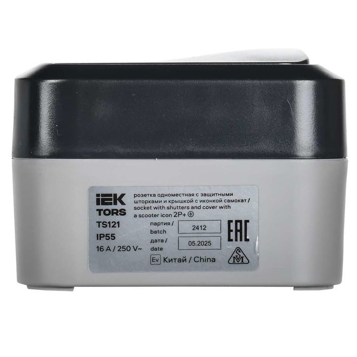TORS Розетка 1-местная с заземлением защитными шторками и крышкой с иконкой самокат 16А IP55 TS121 графит IEK