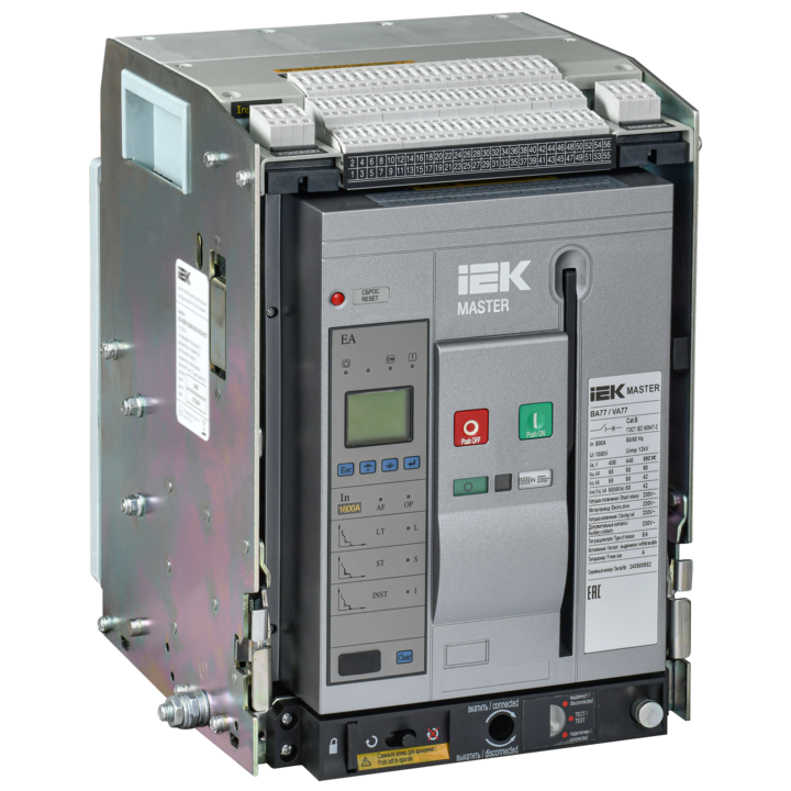 Воздушный автоматический выключатель переменного тока ВА77 выдвижного исполнения 3 полюса типоразмер A 65кА 800А EA с набором аксессуаров: мотор привод катушка включения катушка отключения MASTER IEK