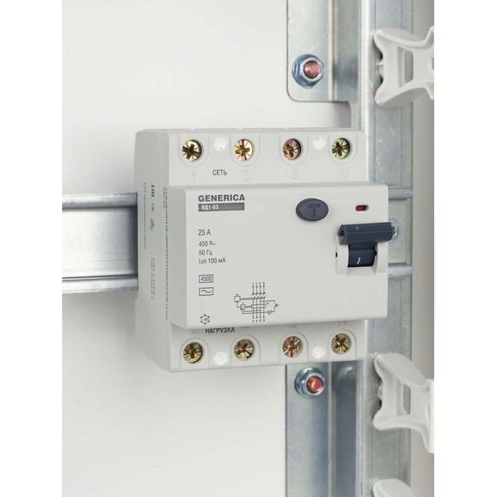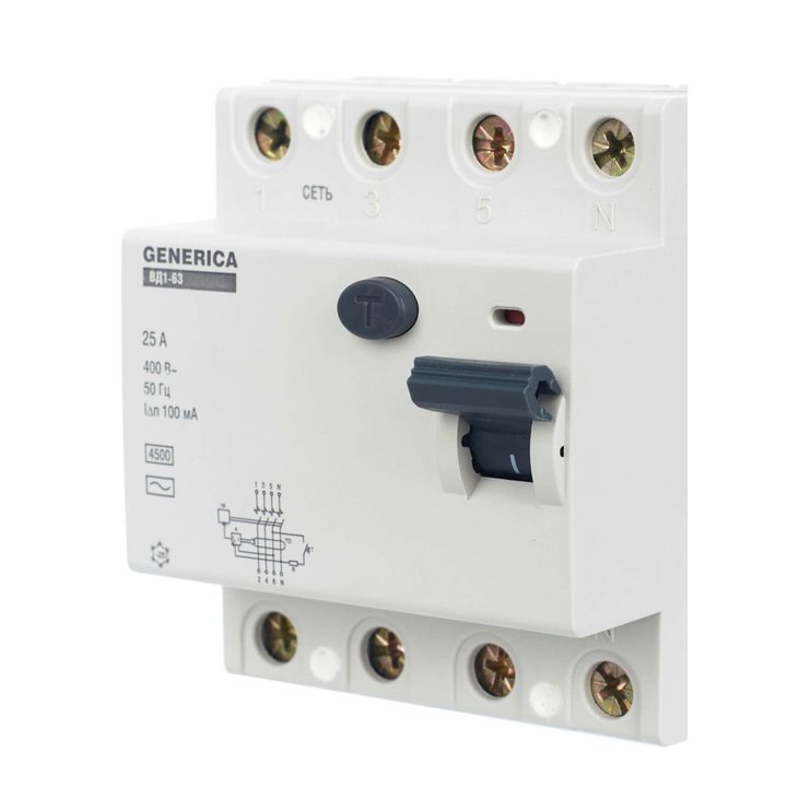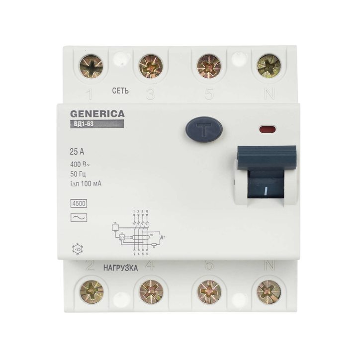 Выключатель дифференциального тока (УЗО) 4п 25А 100мА тип AC ВД1-63 GENERICA MDV15-4-025-100