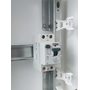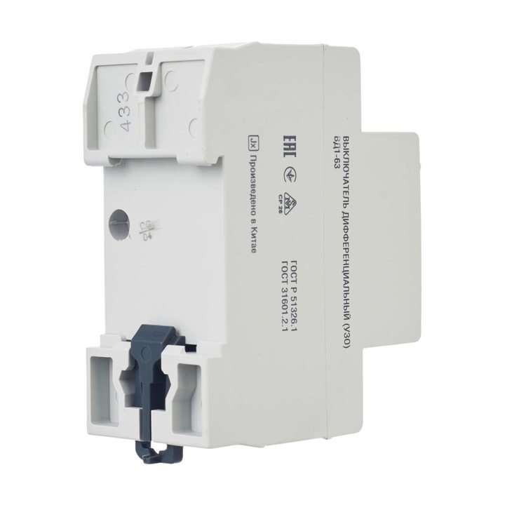 Защелка для крепления УЗО на монтажную рейку выполнена с возможностью фиксации блокирующего и свободного положений.