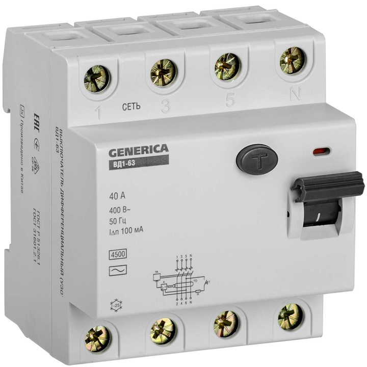 Выключатель дифференциальный (УЗО) ВД1-63 4Р 40А 100мА GENERICA